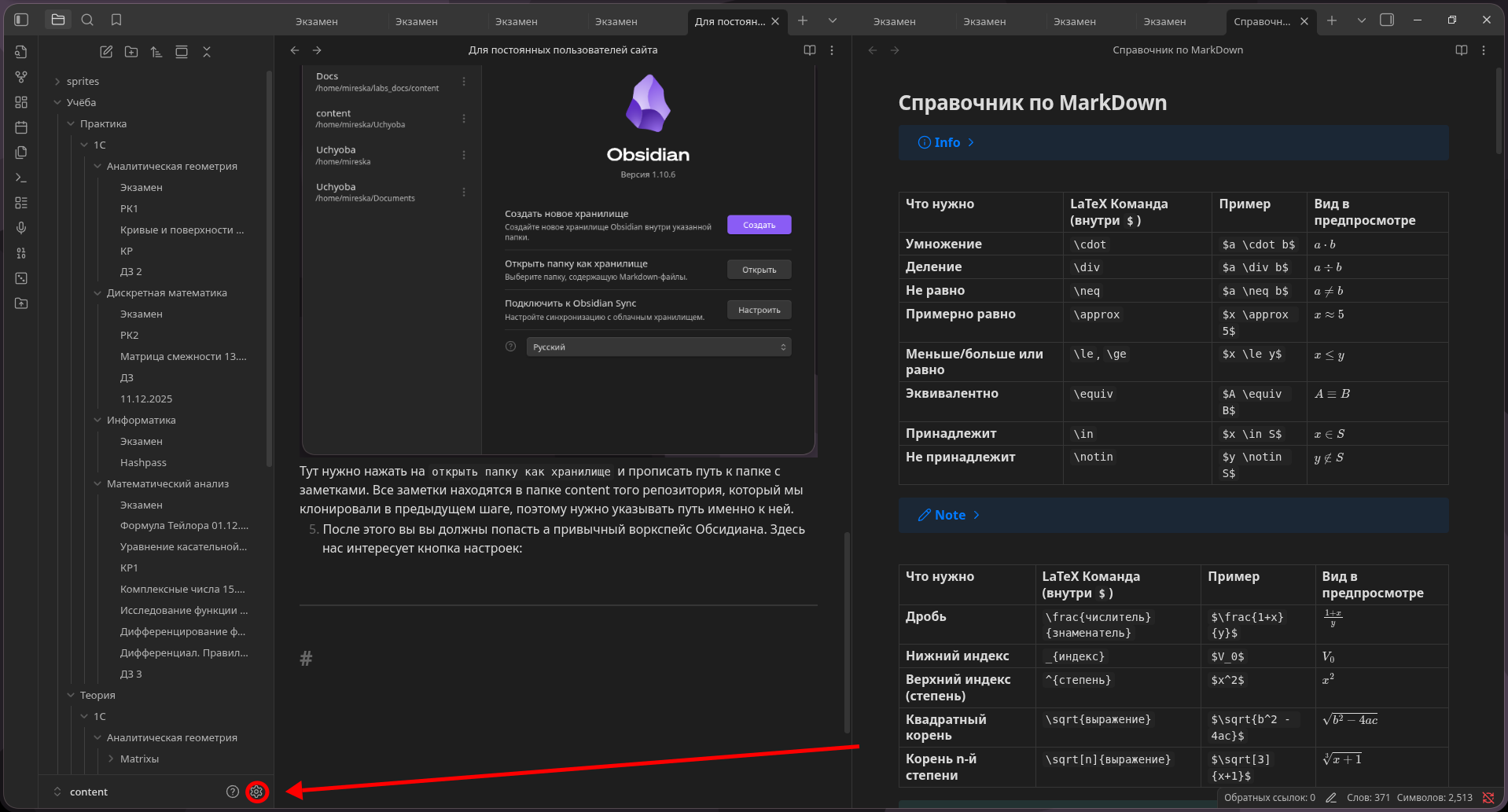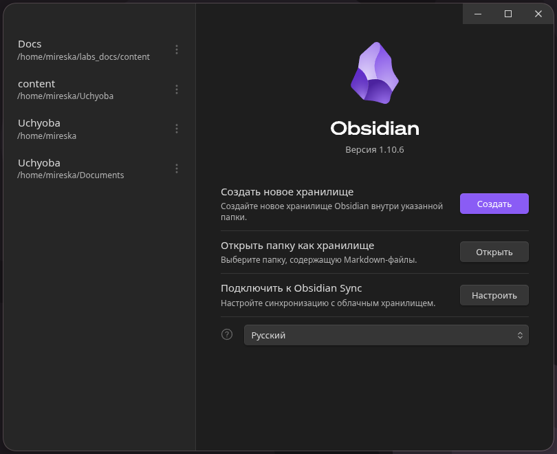 После этого вы должны попасть в привычный воркспейс Обсидиана. Здесь нас интересует кнопка настроек: