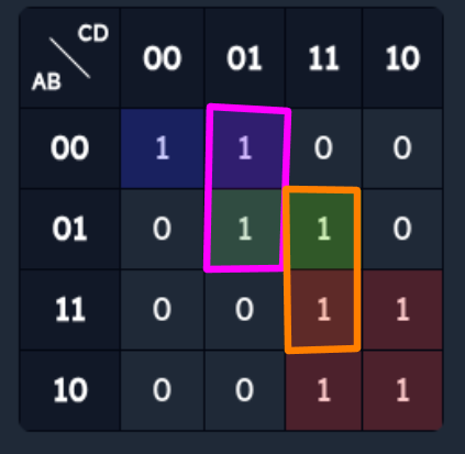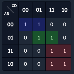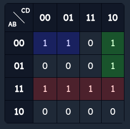 | a | b | c | d | Импликанты, покрывающие клетку |