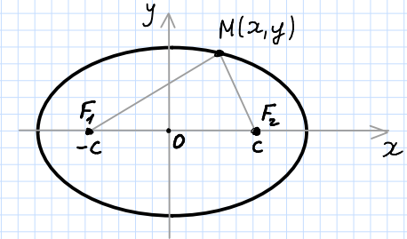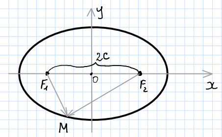 Начало координат совпадает с центром эллипса, фокусы лежат на оси абсцисс. Такая система координат называется канонической системой координат для рассматриваемого эллипса.