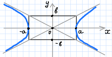 Асимптоты - это продолжения диагоналей этого прямоугольника. Вершины гиперболы - точки пересечения сторон прямоугольника с действительной осью.