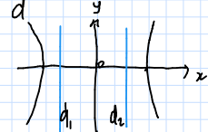 Из уравнения следует, что , то есть внутри полосы от до точек гиперболы нет.